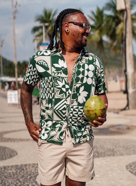 A camisa de botão gola tradicional Mosaic é uma peça que une arte, estilo e sofisticação. Seu destaque está na estampa única, que combina triângulos, círculos, folhas e tucanos, criando um mosaico visual moderno e cheio de personalidade. Cada detalhe da estampa traz equilíbrio entre formas geométricas e elementos da natureza, transformando o blusão em um verdadeiro ícone de estilo.